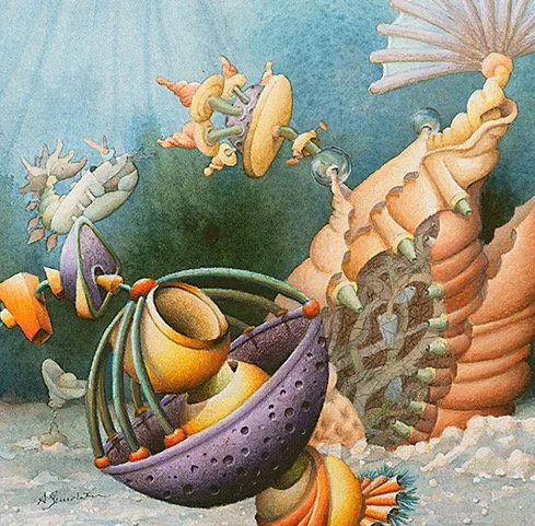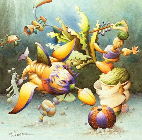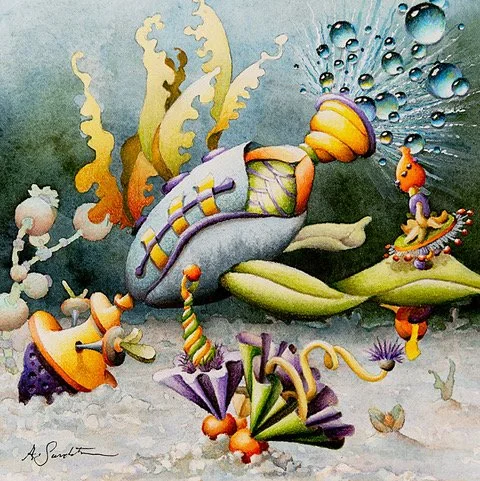 The Diver Was Completely Oblivious to the Giant Sea Pod 8.25” x 8.25” x 1” (framed) Mixed Media: Watercolor, Colored Pencil 2024 price on request