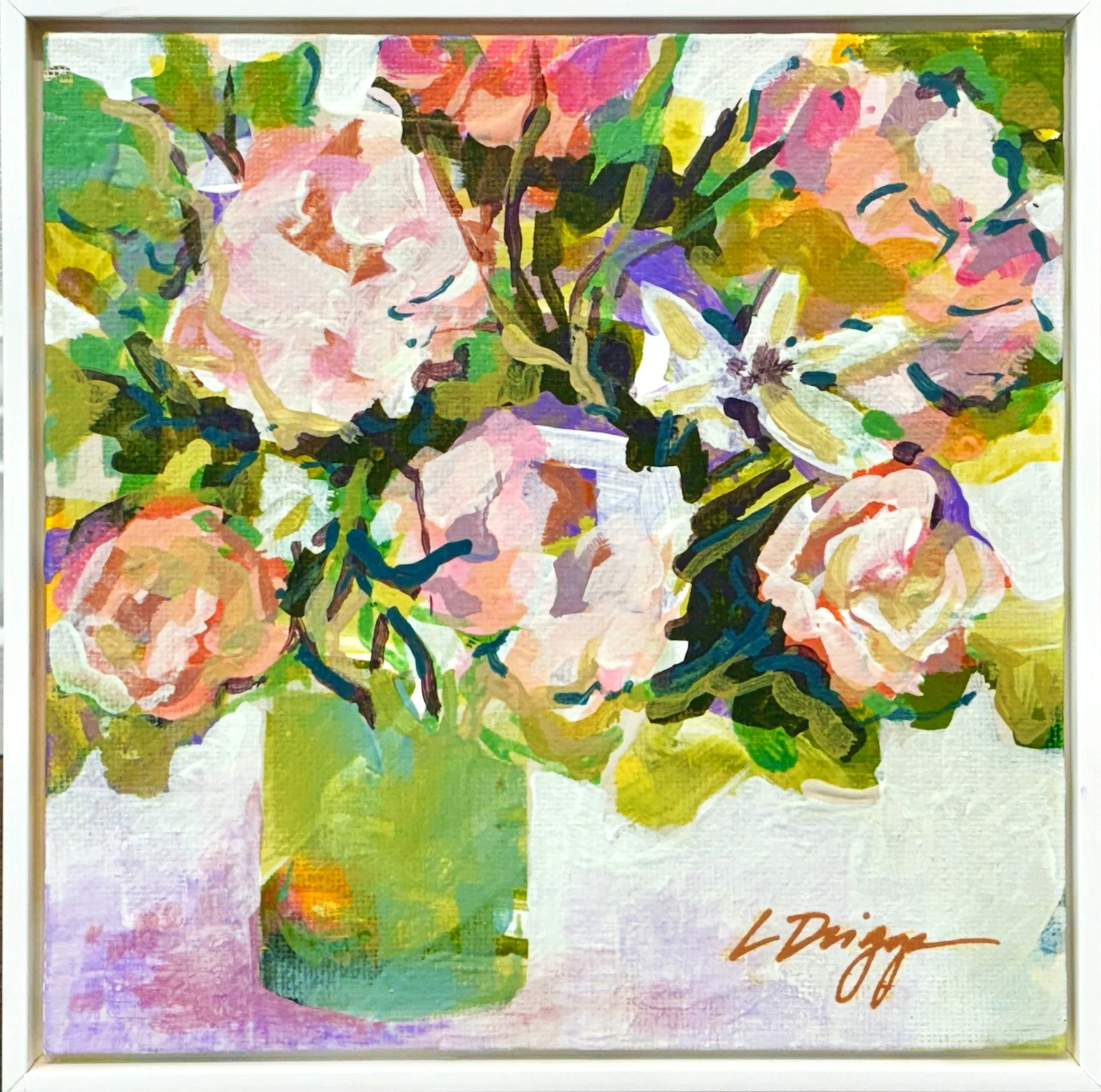 Gardening and spending time outdoors are passions of mine, and these experiences deeply influence my work. I use a bountiful palette of acrylic paints, skillfully mixing primary colors to achieve an infinite array of hues. This allows me to capture the essence and diversity of flowers in a dynamic, expressive style.
